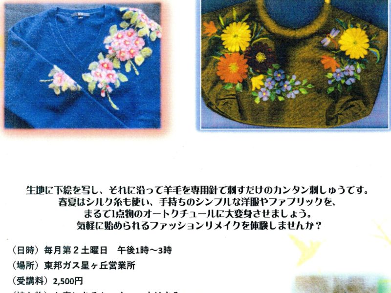 「オランダザンスフォークアート」で私が大変お世話になっている、「大石満子先生」の「羊毛刺しゅうでファッションリメイク講座」開講のご案内です。 シンプルなセーターやTシャツ等 …