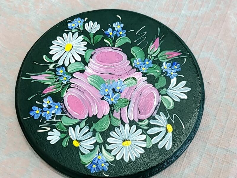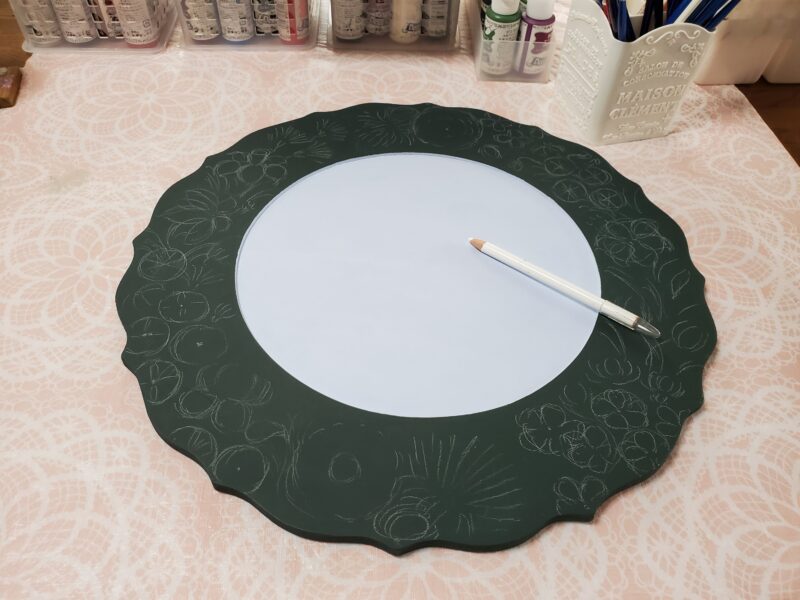 大きめボードに描きました。 地塗りして下描きしたところです。実はこの後、真ん中の〇の部分を、グリーンに塗りなおしています。 完成作品です。 大きくて、お花をたくさん入れたかったので、ちょ …