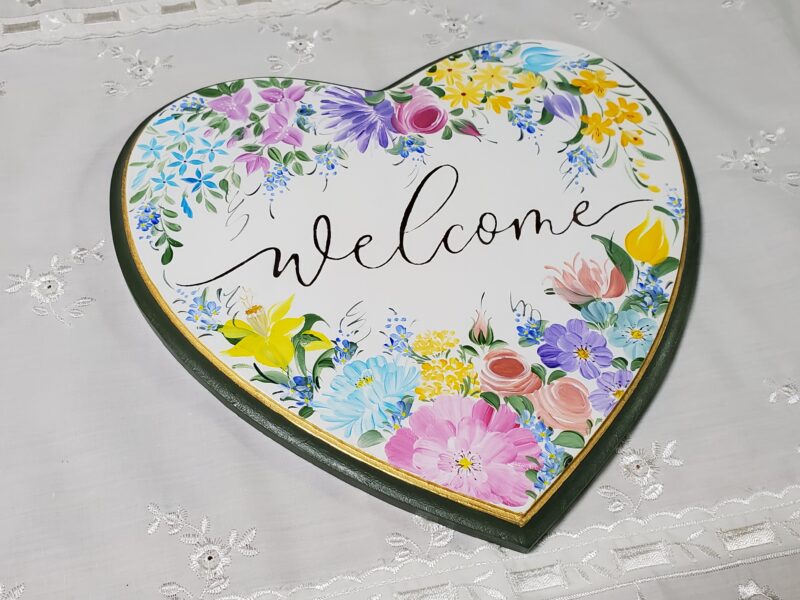 下地を塗り、「Welcome」の文字を描いたところでしばらく放置していたハート型ボード。 下の画像は、縁取りを塗るときに、マスキングテープで養生している状態です。 アッセンデルフトグリーンで厚み部分を …