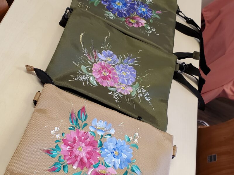暮らしの学校安城アンフォーレ校様で、今日の1日講座、無事に終了しました。 今日は薄いバッグ、サコッシュにペイントしました。 いつもながら、同じデザインを描いても皆さん、個性が出て違う仕上がりになるとこ …