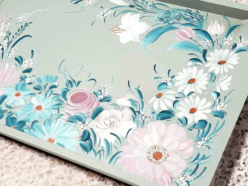 友人からの依頼でミニトレイにペイントしました。 彼女はキルトが趣味で、キルトをしながらお茶を飲む時に使いたいと言ってくれました♬ サイズは約 縦18cm × 横27cm くらいです。 かれんと様に展示 …