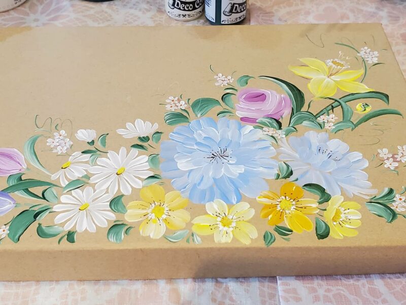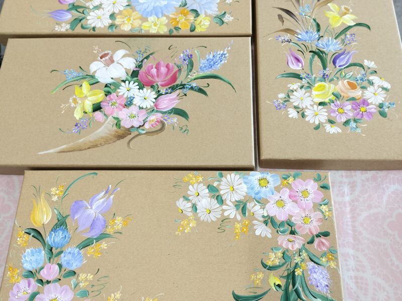 先週のレッスンの様子です。 昨日もオリジナル作品が完成しました✨ Eさんがこれまでに練習で描いてきた100均の箱の蓋。 これが100均?ですよね~。最近の100均ショップのクオリティはほ …