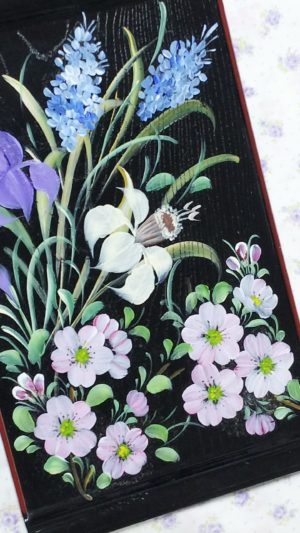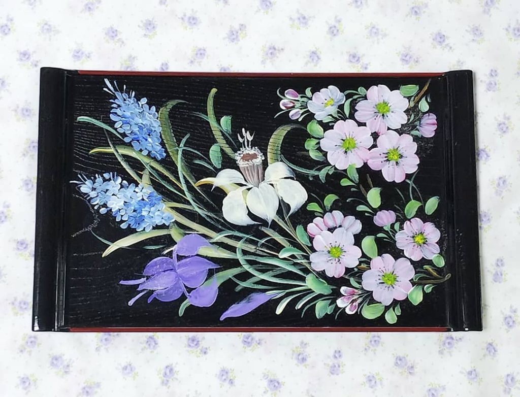 黒いミニトレイに、桜・バックハウスナルシス・あやめ・ストックを描きました。