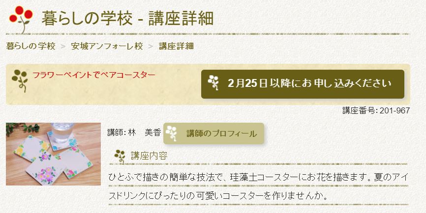 Webでのお申込み受付は2/25からになりますが、定員は各講座6名と少人数ですので、ご興味のある方はお早目に「暮らしの学校安城アンフォーレ校」様までお問合せ下さいませ。