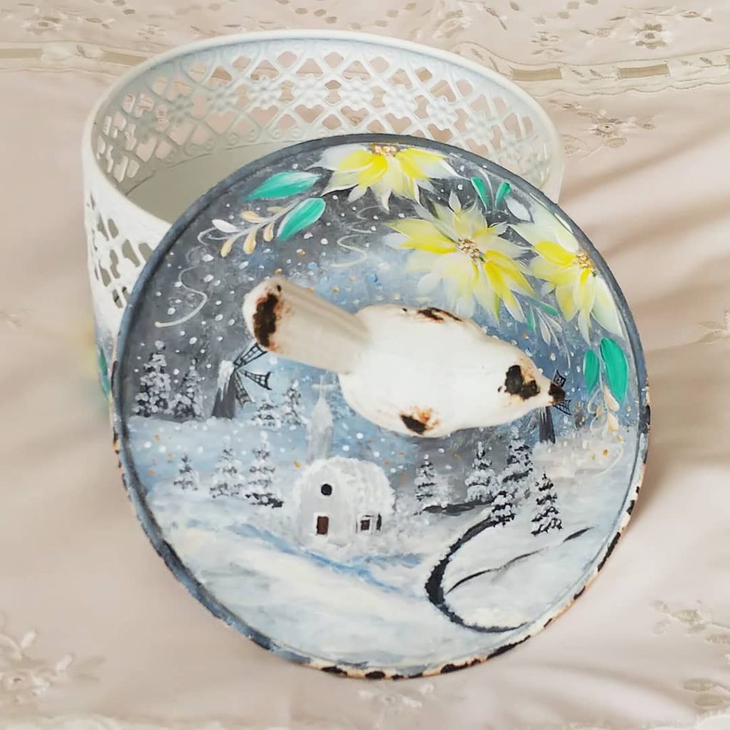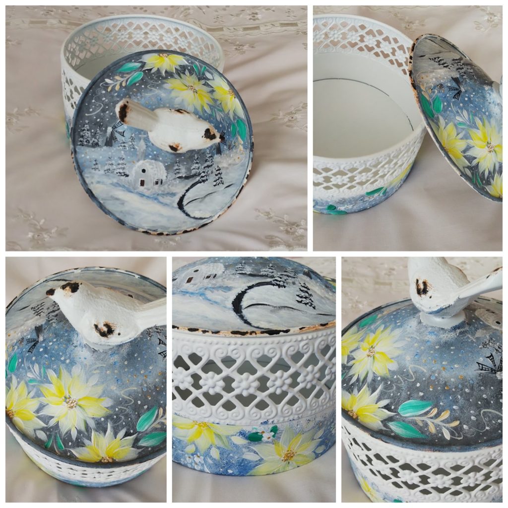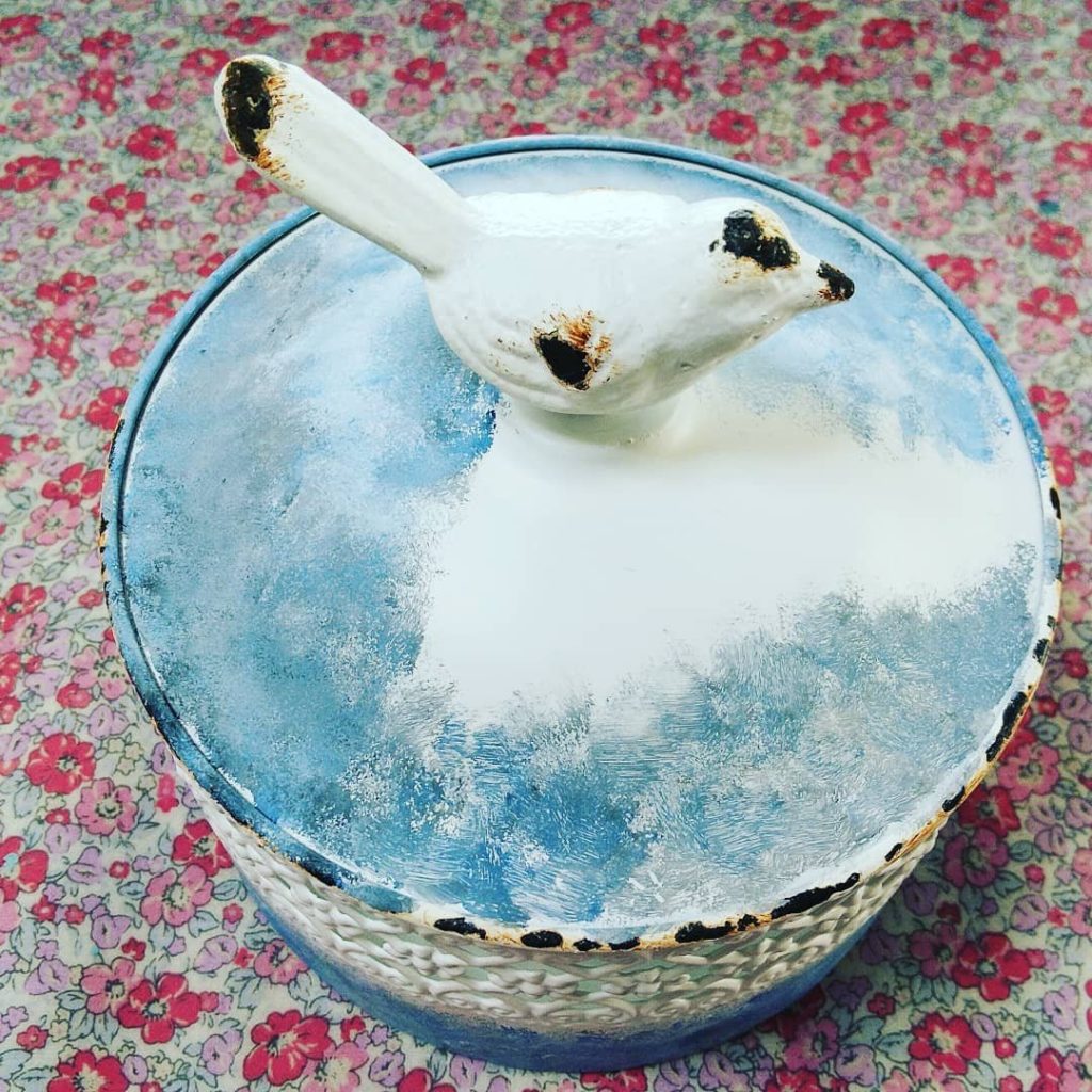 直径13センチくらいの、蓋の取っ手が鳥の形をした、真っ白な小物入れです。