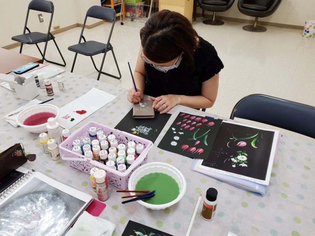 今日は、お財布を持参されたので、先月までに習ったマーガレットと、今日のお花、チューリップを一緒にデザインして描かれました。