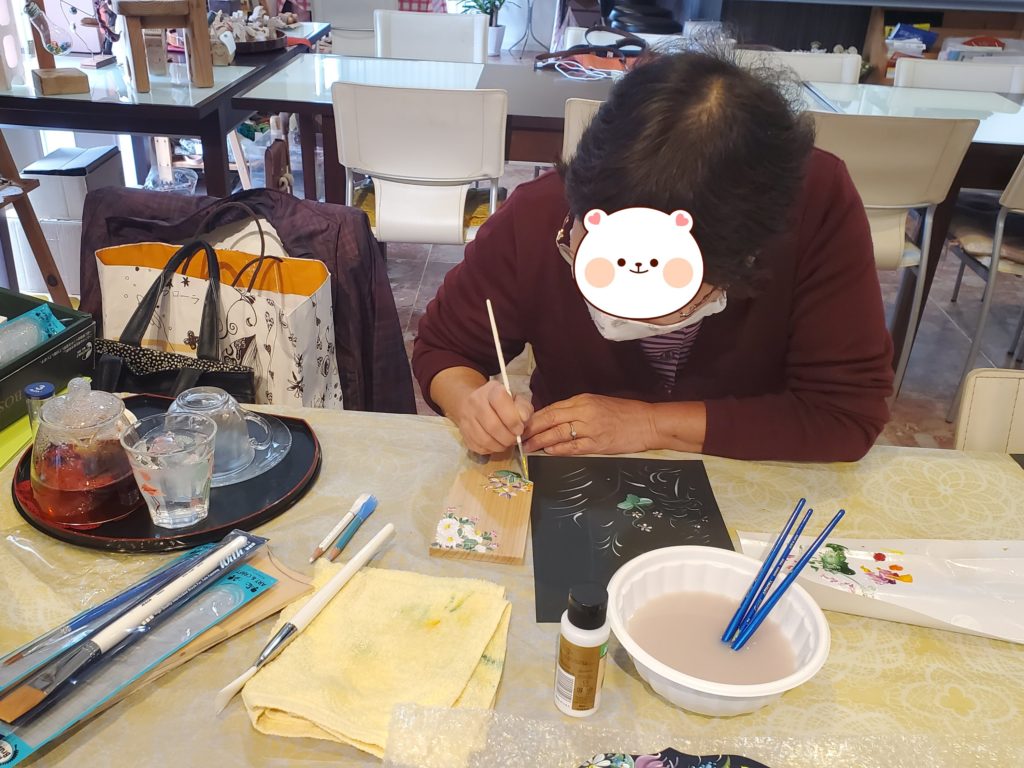 前回からの続き、小さな羽子板にスミレとマーガレットを描いていらっしゃいます。