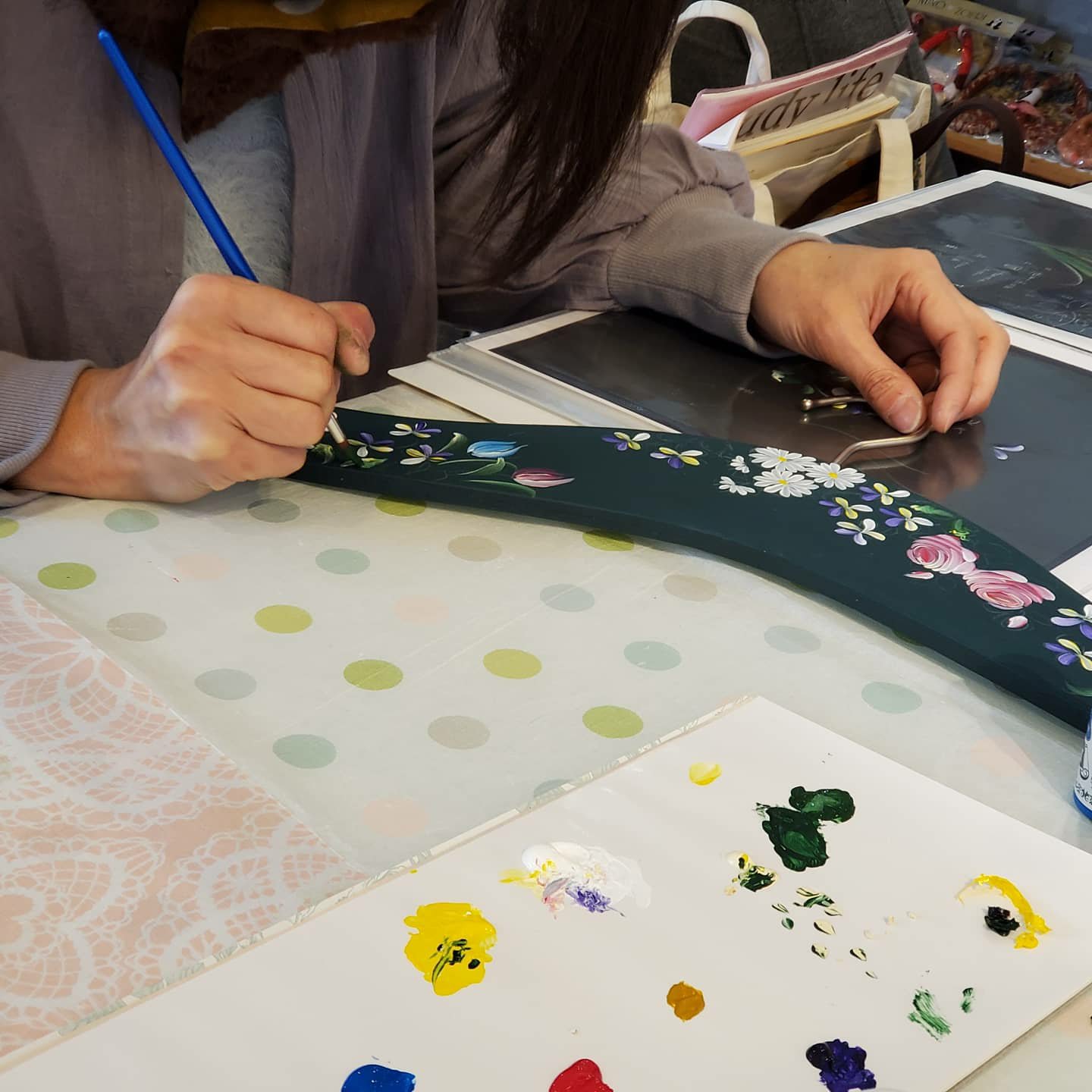 先日のレッスン。.Oさんの、3本めのハンガー制作中o(^o^)o.今度は「すみれ」が入りますすみれは小さいですが紫と黄色で、少し入れるだけで可愛い作品になります。.次回には出来上がりそうなので、私も見せてもらうのが楽しみです(*^^*)