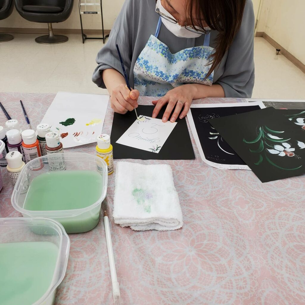 名古屋トヨペット矢作店様でのレッスン。出産をこの夏に控えたMさんは、お子さんのための月齢カードにペイントをされています(*^^*)今回は、「バックハウスナルシス」を練習して、2枚の月齢カードを描きました(^-^)/