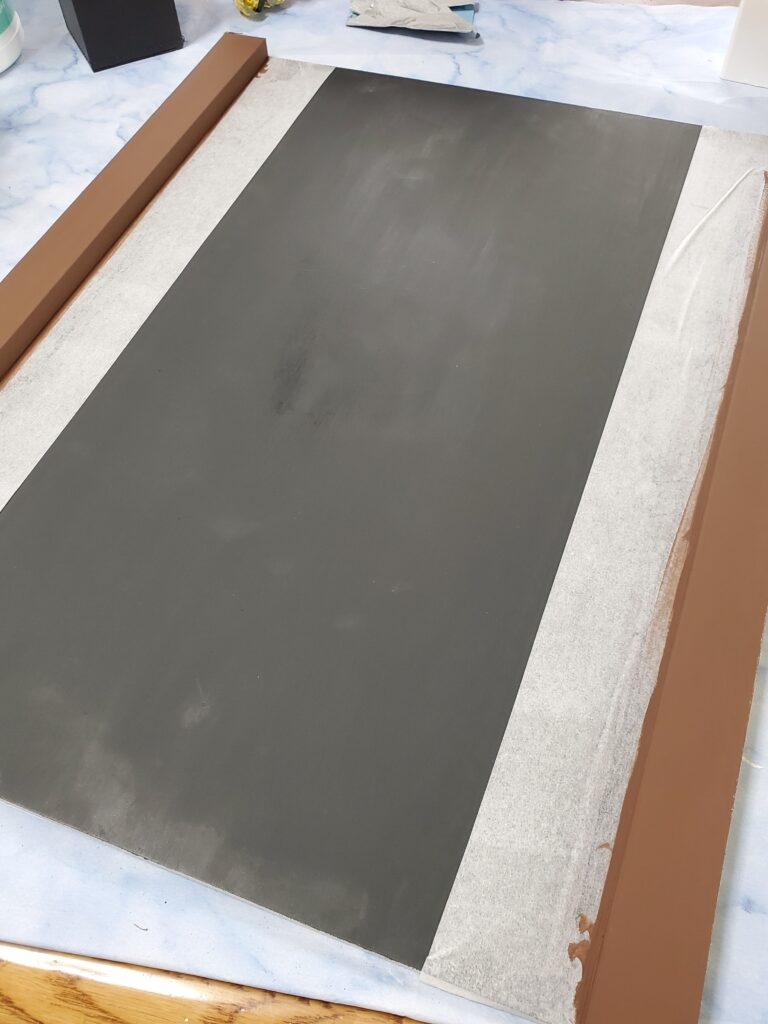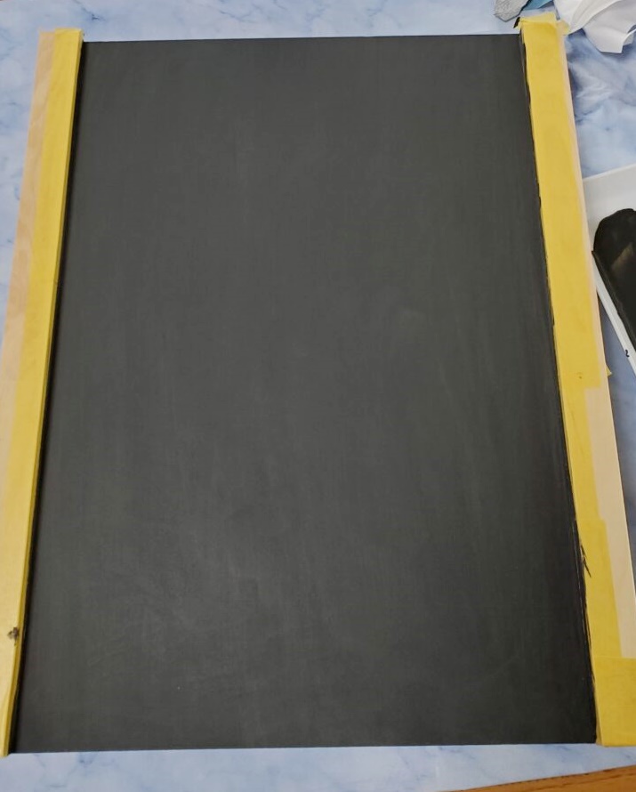 こちらは、黒の面を白の幅広マスキングテープで養生して、上下のフレーム部分にブラウンを塗ったところです。