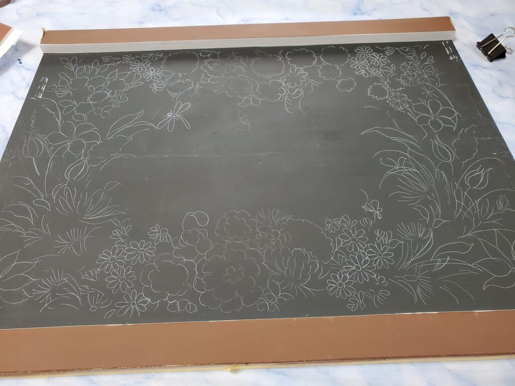 今回は、小林広子先生のデザインを描かせていただいたので、デザイン画を白のチャコペーパーを使ってトレースしました。
