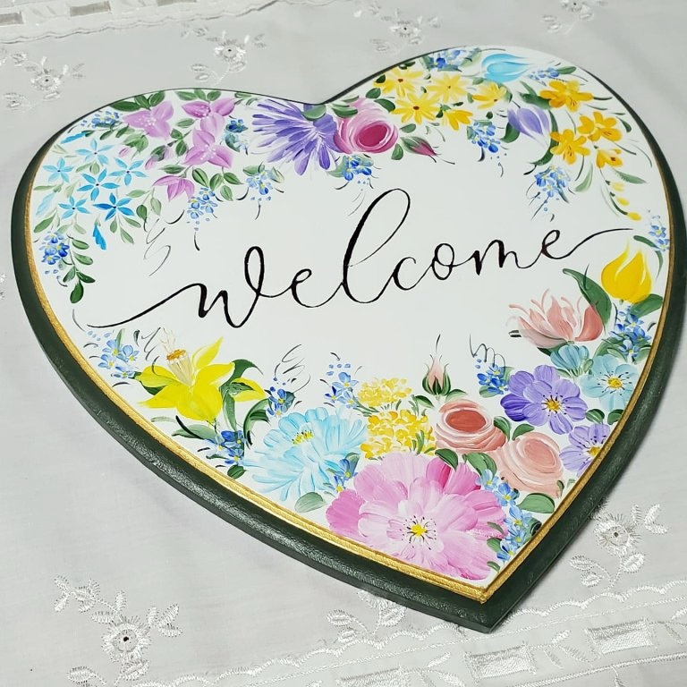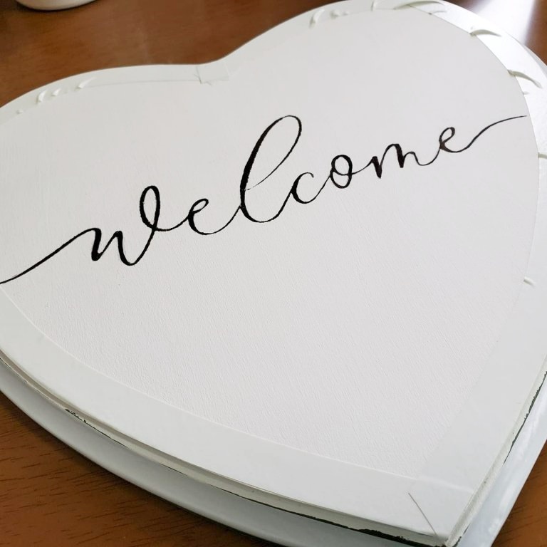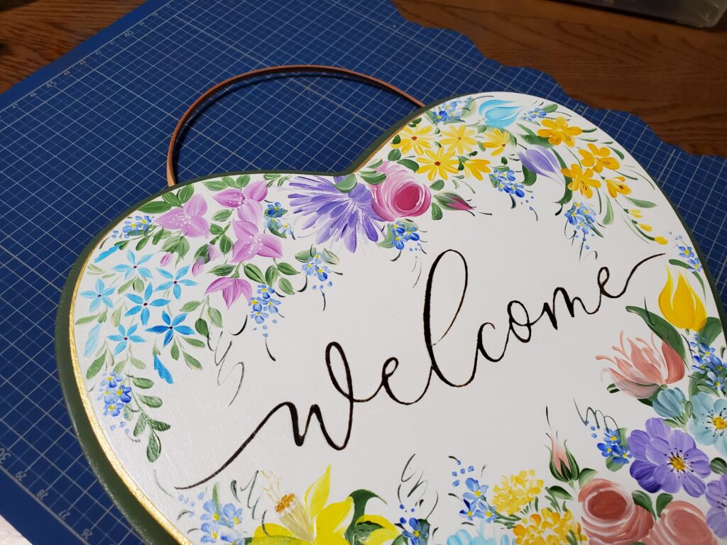 下地を塗り、「Welcome」の文字を描いたところでしばらく放置していたハート型ボード。