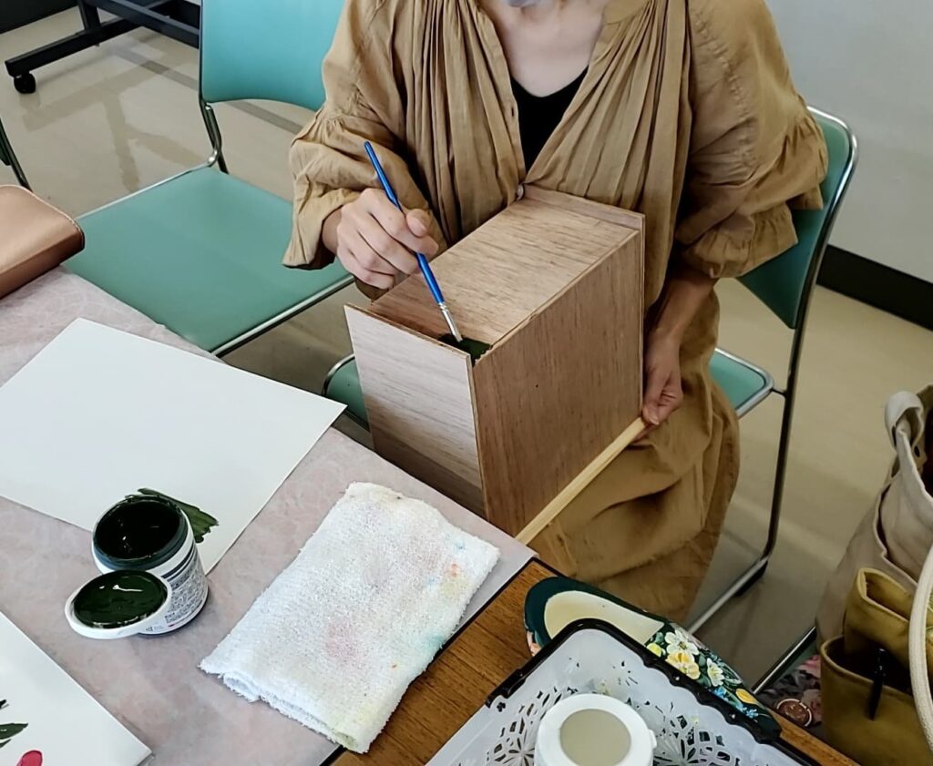 ↓ハンドメイドの絵具ボックス制作中のEさん。