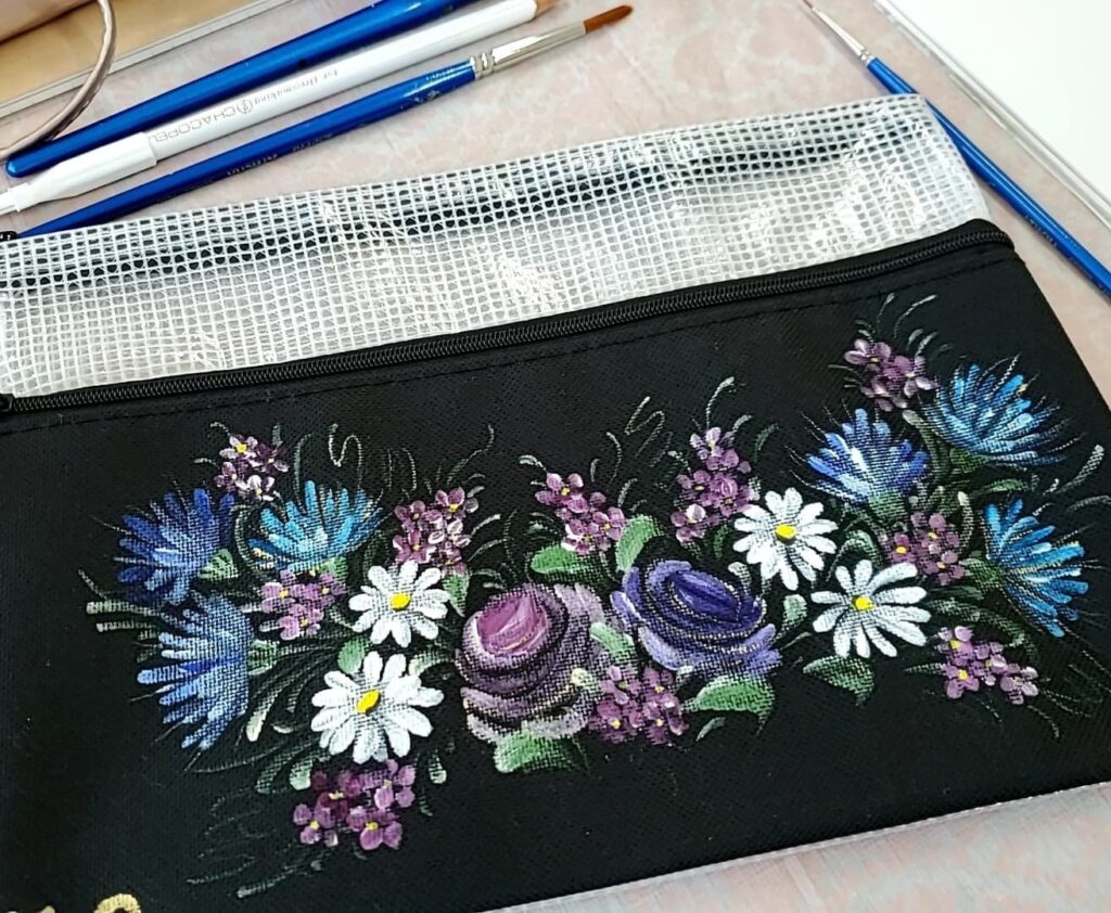 ↓Oさんがペイントしたポーチ。最近は100均の商品も良いものがあり、ペイントされる方が多いです。
