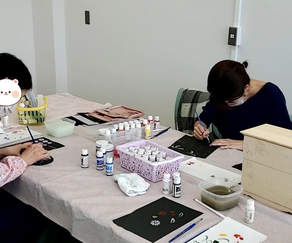 こちらは別日で、絵具ボックス制作継続中のEさんと、前回からコースターにバラをペイントしているIさん。