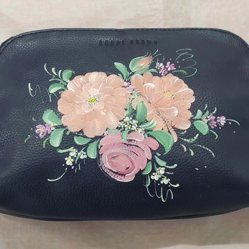 Oさんは、無地のポーチに大輪バラをペイントされました。落ち着いたアッシュロースで、可愛くなりすぎず良い感じに仕上がりました(^.^)