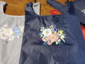 こちらはカラフルな折りたたみマルシェバッグ。コンビニのお弁当が入る大きさです。