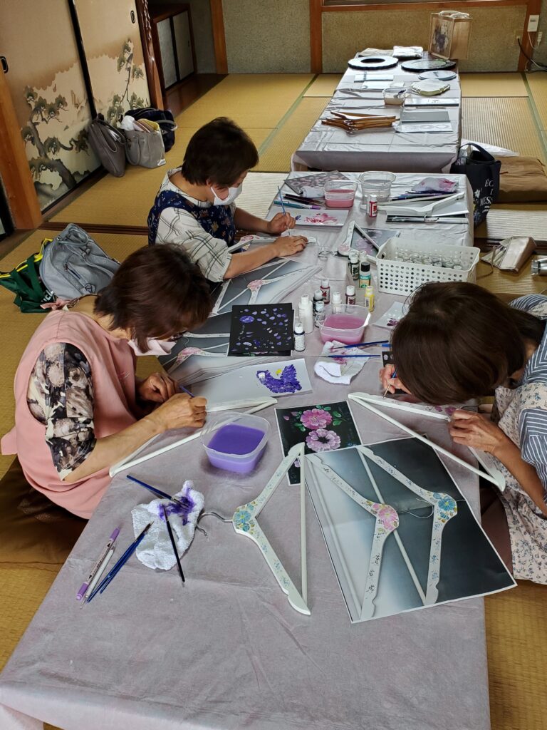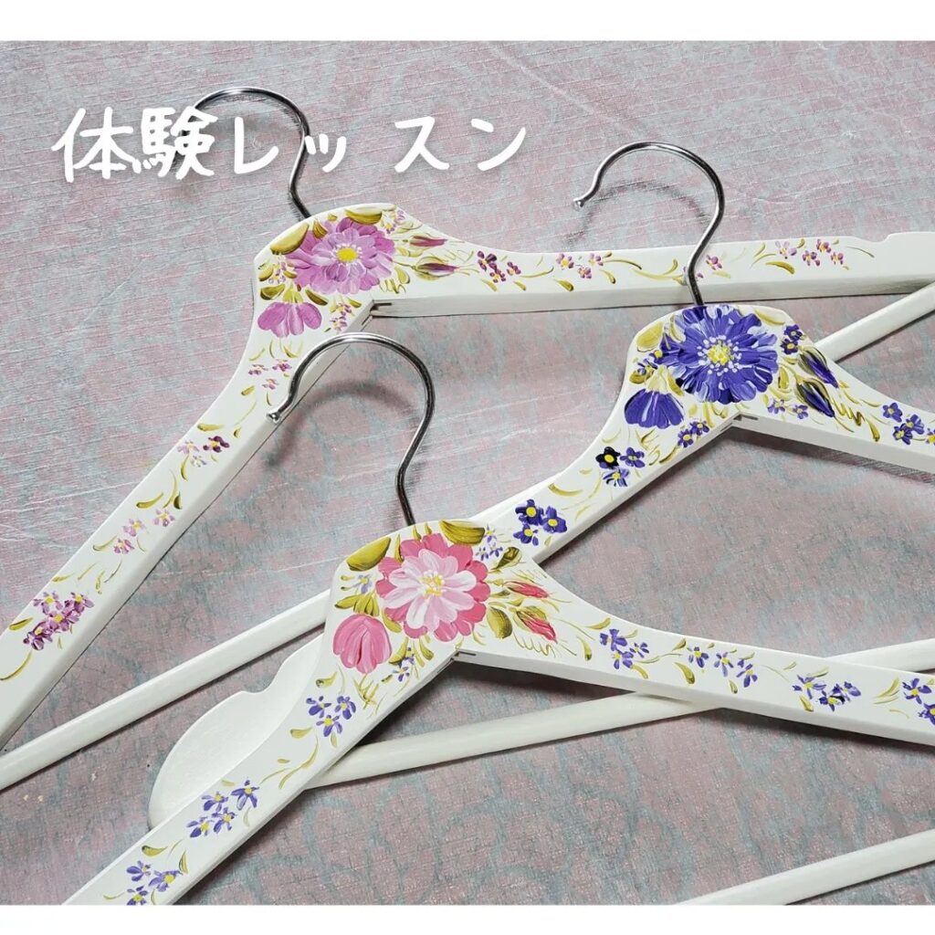 皆さん、トールペイントは初めてとのことで、できるかしら~と不安そうでしたが、描き始めるとどんどん筆が進み、2時間でフラワーペイントのハンガーを完成されました(^-^)
