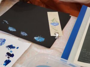 Oさんは、「しおり」に矢車草や、和ロウソクにもお花を描いていらっしゃいましたよ~。