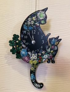 黒猫親子の掛け時計です。小林広子先生デザイン。時計の文字盤いっぱいのお花です。
