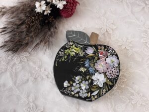 リンゴなので赤や黄色に塗ることが多いかと思いますが、オランダザンスなので黒にして「オトナな林檎」のイメージでペイントしました(*^-^*)