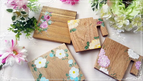 964product様オリジナル木製コースターに、ワンポイントでお花を描きます。筆や絵の具はお貸ししますので、お気軽にご参加下さい。