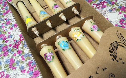 もともと、パッケージも可愛いろうそくなのですが、ワンポイント描いたことでまたちょっとオリジナル感でたかな~と思います。普通の仏具屋さんで販売されてるそうですよ。