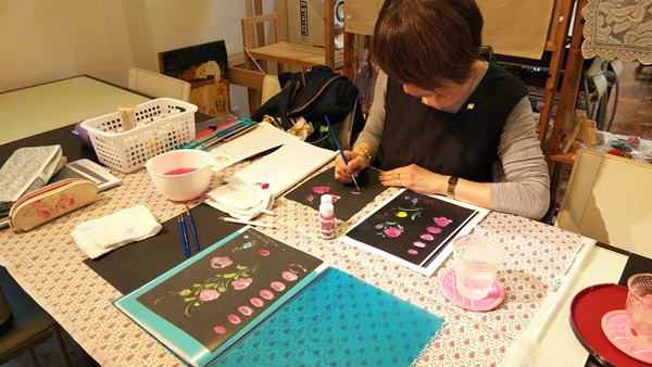 〇体験レッスン・・・1,000円教材費込み。次回は珪藻土のコースターにバラの花を描く体験です。