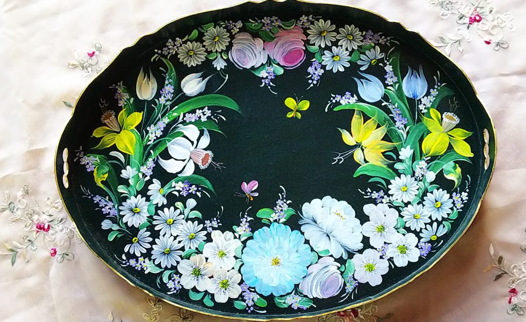 トールペイントではおなじみの、木製品の作品。オランダザンスフォークアートでは下地はダークグリーンが基本ですが、お好きな色でもOK。下地を塗ってから描いていきます。