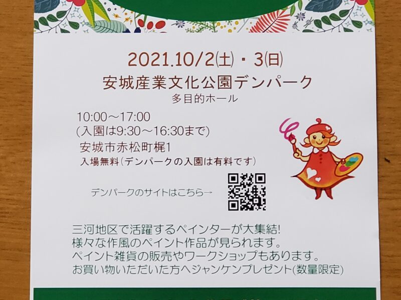 安城市のデンパークで開催される「MIKAWA ペイントピクニック」に、参加させて頂くことになりました。 ・日時 2021.10/2(土)・3(日) 10:00-17:00(入園は9:30~16:30ま …